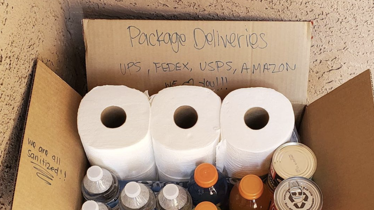 As a result, we need to thank those that risk their well-being in order to help preserve ours. One homeowner has taken upon themselves to do just that by leaving a box of supplies for delivery workers at their front door.